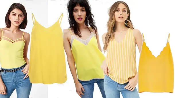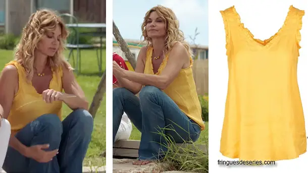 Chloé (Ingrid Chauvin) portait un top jaune avec des volants au col et aux manches dans l’épisode 262. Il est de la marque Le Temps des cerises. cela nous adonné l’idée de faire une sélection de débardeurs, de caracos de la même couleur.