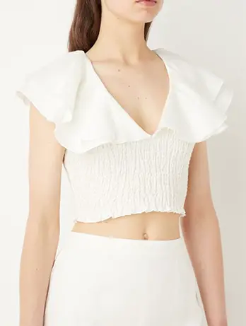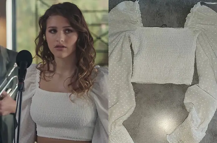 Betty (Lou Jean) portait un crop top smocké, avec des manches bouffantes dans Demain nous appartient 950. Il ‘agit d’un modèle, en rupture de stock, Bershka.
