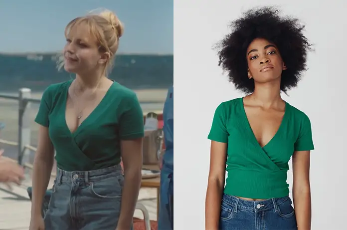 Judith (Alice Varela) porte un t-shirt cache-cœur côtelé vert dans Demain nous appartient 1251. Il n’existe plus dans cette couleur, mais on le trouve encore en marron ou en jaune ici