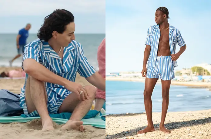 Manny (Gabriel Sand) passe du temps sur la plage, avec Jack, dans Demain nous appartient épisode 1987. Le jeune homme porte un ensemble chemise short de bain à rayures.