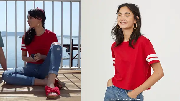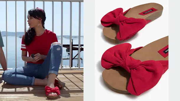 Lola (Alice Révérend) en grande discussion avec Alex dans l’épisode 234 de Demain nous appartient. Aux pieds, des sandales avec un gros nœud rouge