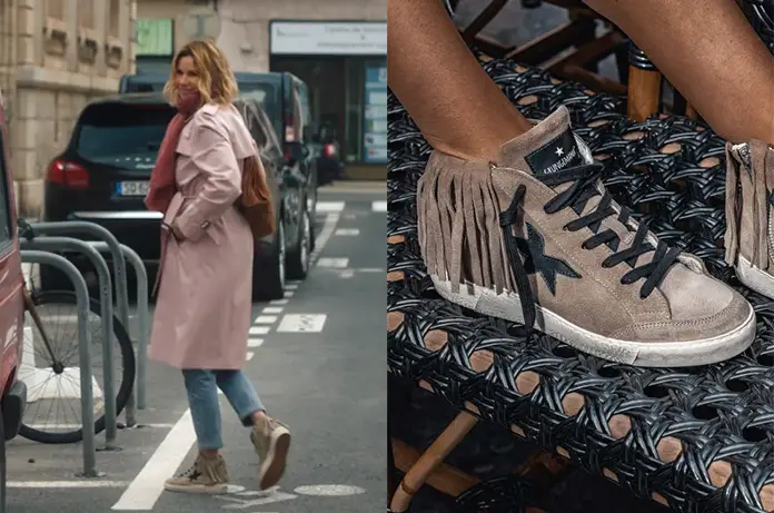 Chloé (Ingrid Chauvin) décide de rentrer chez elle à pieds dans Demain nous appartient 1415. Elle porte aux pieds une paire de sneakers à franges que l’on trouvait ici.