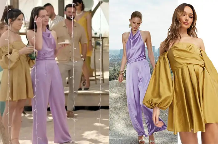 Sara porte une combinaison violette avec encolure américaine. Il s’agit d’un modèle Zara épuisé, mais que l’on trouve encore sur AliExpress.