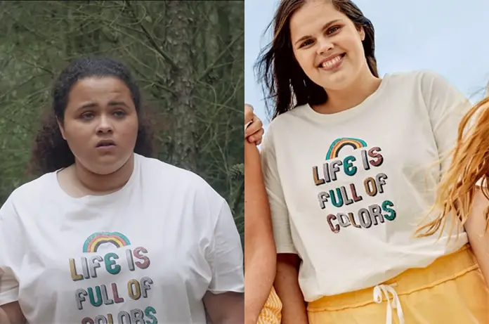 Lizzie (Juliette Mabilat) veut la vie en couleurs, entre la forêt et la plage dans Demain nous appartient 1003. C’est ce que dit son t-shirt qu’on trouvait ici.
