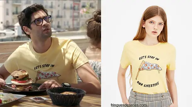 Georges (Mayel Elhajaoui) n’a pas hésité, ce sera le giant burger du Spoon dans l’épisode 259 de Demain nous appartient. Même si son t-shirt se portait plus vers la pizza. ce t-shirt était disponible chez Pull & Bear.
