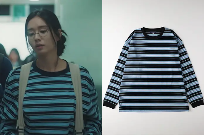 On découvre Go Da-rim (Ahn Eun-jin 안은진) avec ce t-shirt rayé à longues manches dans le premier épisode de Dynamite Kiss (키스는 괜히 해서!).