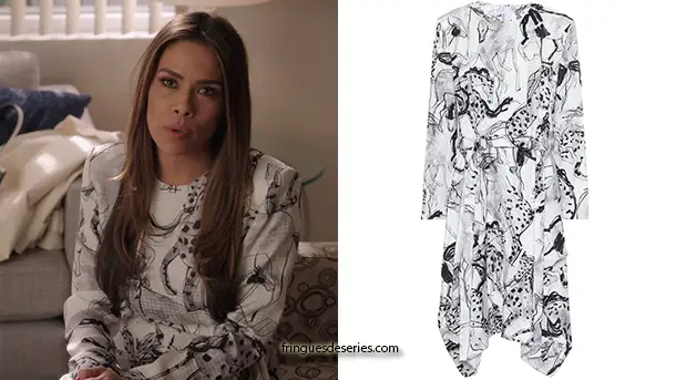 Cristal (Daniella Alonso) se perd, à la fin de l’épisode 17 de la saison 3 de Dynasty une robe blanche à dessins imprimés. On la trouve ici.