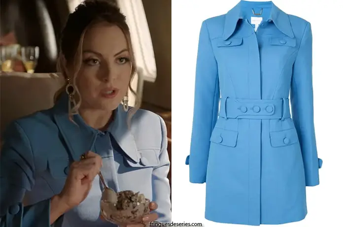 Fallon (Elizabeth Gillies) mange sa glace au chocolat, dans la 4e saison de Dynasty, dans un élégant manteau bleu.
