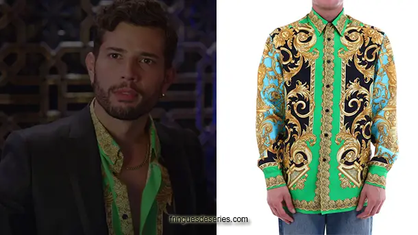 Sam (Rafael de la Fuente) portait une chemise baroque verte en soie dans le 6e épisode de la 3e saison de Dynasty. On la trouve ici ou ici