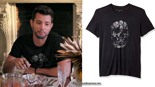 Sammy Jo (Rafael de La Fuente) ne sait pas encore qu’il va revoir son père au petit déj de l’épisode 10 de Dynasty. Il porte un t-shirt John Varvatos