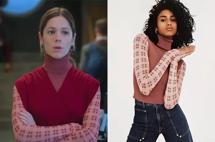 Cayetana (Georgina Amorós) porte un pull à col roulé rose, avec des manches contrastantes à carreaux, dans la 5e saison d‘Elite. On trouvait ce pull chez Zara