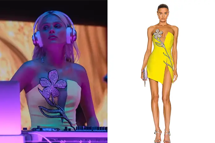 Pour son dernier set, dans Elite 6×08, Isadora (Valentina Zenere) porte cette mini robe jaune avec une grande fleur argentée