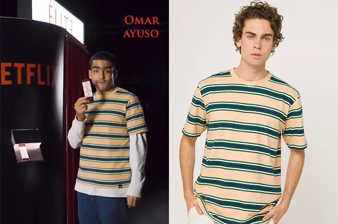 Omar Ayuso est de retour dans Élite, une belle surprise pour la saison 7. Dans la vidéo qui annonce cela, il porte un t-shirt rayé. On le trouve ici