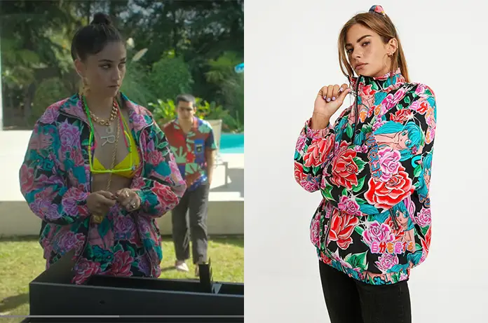 Dans ELITE : Short stories – Omar Ander Alexis, Rebeka (Clauia Salas) accueille ses amis dans un ensemble très fleuri. On devine des personnages de mangas et des inscriptions japonaises, parmi les fleurs. Les voyez-vous ?