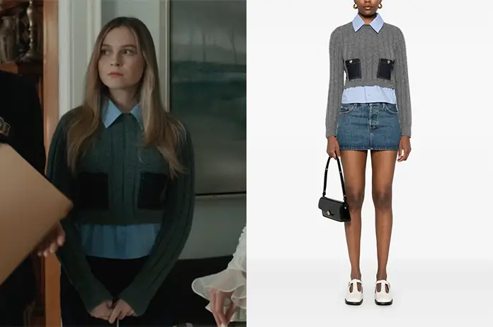 Avery porte un pull court Sandro en laine et cachemire gris. Cette pièce hybride intègre directement des empiècements de chemise, avec un col contrasté et un ourlet dépassant au bas du vêtement. Le détail qui fait toute la différence ? Les deux poches plaquées en denim sur la poitrine, boutonnées, qui cassent le côté classique du tricot torsadé.