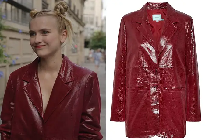 Camille (Camille Razat) accompagne ses parents dans Emily in Paris 3×06 avec ce blazer en cuir de chèvre rouge.