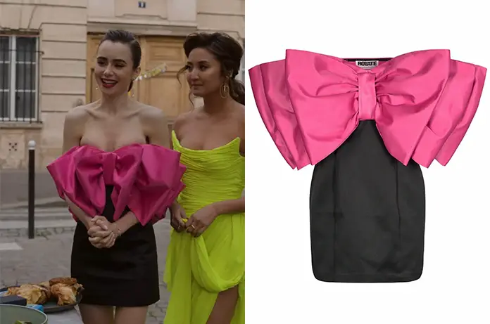 Pour son anniversaire, dans Emily in Paris 2×03, Emily (Lily Collins) porte cette minirobe avec un énorme nœud rose. On la trouve encore sur eBAy