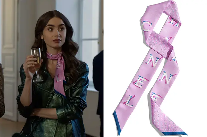 Emily Cooper (Lily Collins) porte un foulard rose de la maison Chanel (collection été 2019) dans le 4e épisode de Emily in Paris. On le trouvait ici.