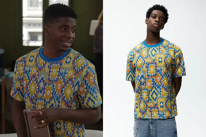 On trouve ici le t-shirt jacquard très coloré que porte Julien (Samuel Arnold) dans le premier épisode de Emily in Paris, saison 3, sur Netflix