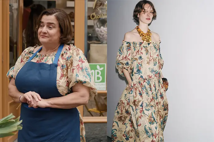 Madame Bernard, la boulangère (Tatiana Gousseff) donne une nouvelle leçon de français à Emily dans Emily in Paris 5×05. Elle porte une jolie robe à motif floral, avec les épaules dénudables. La boulangère est plus pudique que le mannequin.