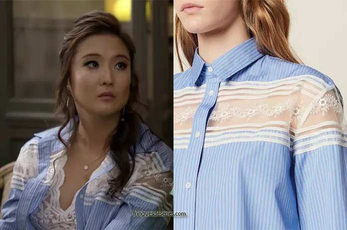 Dans Emily in Paris 1×05, Mindy (Ashley Park) rejoint Emily dans une chemise bleue à rayures, avec de jolies insertions de dentelles. Il s’agit d’un ancien modèle Sandro.