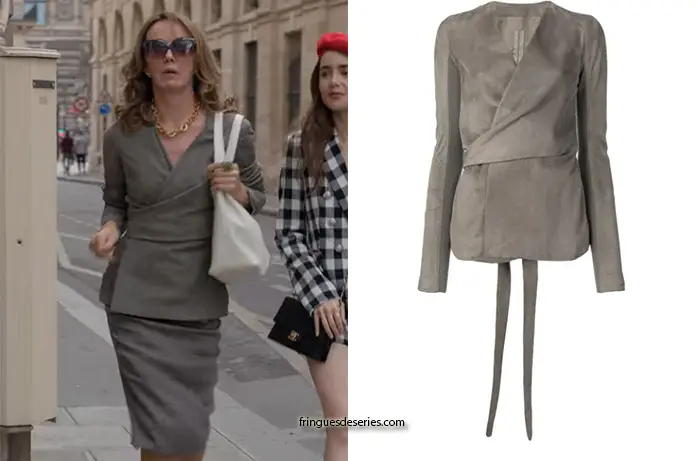 On adore la tenue jupe veste grises de Sylvie (Philippine Leroy-Beaulieu) dans Emily in Paris 1×03