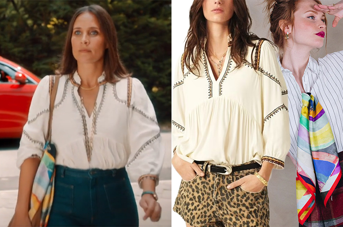Dans le même épisode, on la voit dans une magnifique blouse blanche d’inspiration bohème, que l’on trouve ici. Son foulard (attaché au sac) se trouve ici