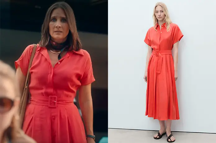 Erica (Julie de Bona) porte une robe rouge avec un col chemise dans l’épisode 7 d’Erica.
