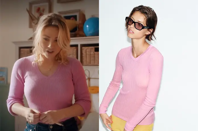Dans le septième épisode de la série Erica, Anna (Maud Baecker) arbore un pull en maille cannelée mauve pastel (voire rose ?).