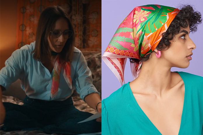 Dans le même épisode, elle porte également un carré de soie qui représente une serre tropicale.