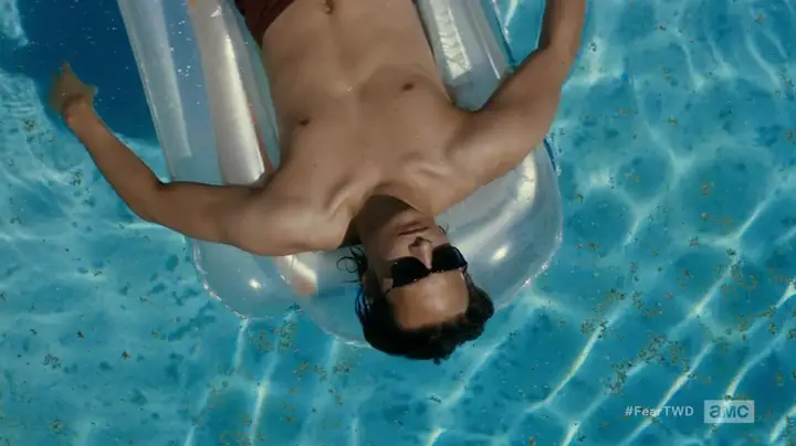 Dans le 4e épisode de Fear the walking dead, on peut encore se la couler douce… C’est ce que fait Nick (Frank Dillane) qui profite de la piscine, en short de bain rouge.