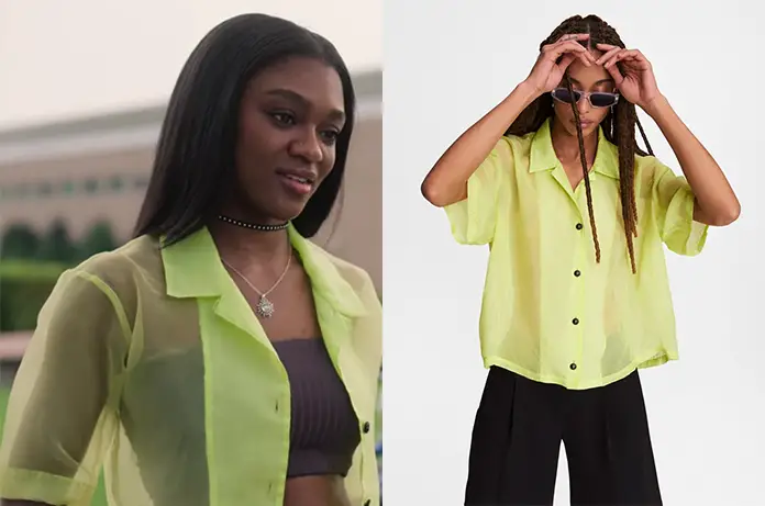Calliope (Imani Lewis) porte une chemise jaune transparente dans le premier épisode de First Kill, sur Netflix. On la trouve ici