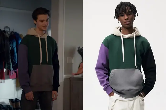 Marcus (Felix Mallard) apparait au début de l’épisode 2×07 de Ginny and Georgia, sur Netflix, avec un sweat à capuche colorblock.