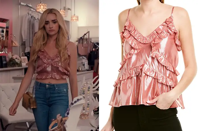 Dans Ginny & Georgia 1×01, Georgia (Brianne Howey) fait du shopping dans une petite blouse en soie rose, légèrement modifiée. On la trouve ici
