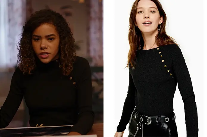 Ginny (Antonia Gentry) porte ce joli pull noir à l’épaule boutonnée dans Ginny & Georgia 1×05. On le trouve en seconde main, ici, par exemple.