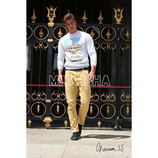 Après une longue absence, des semaines à Istanboul et à Shangai, Giovanni Bonamy, le modèle chouchou de Fringues de séries est de retour au pays. Le jeune homme a déjà repris ses habitudes (qui lui manquaient, faut bien l’avouer)… faire la fête ou du sport avec ses meilleurs potes… Et après une virée à Londres pour aller hurler avec Robbie, il nous offre une photo d’une nouvelle marque : MaadSha. MaadSha est un label créé par la très jolie Chaïma El Aidi. On trouve des t-shirts, des débardeurs, des sweats graphiques.Edition limitée.