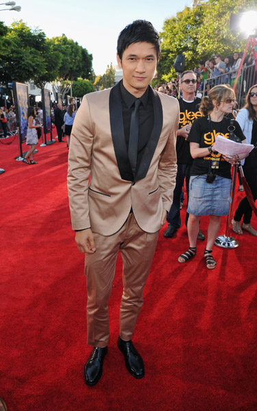 Harry Shum Jr, tout comme d’autres acteurs de Glee, Kevin McHale par exemple, aime beaucoup la marque Topman. Ici, on le voit à la première de Glee: The 3D Concert Movie le 6 août dernier avec ce costume couleur nude (l’autre tendance de l’été, l’anti color-block)contrasté avec un col noir.