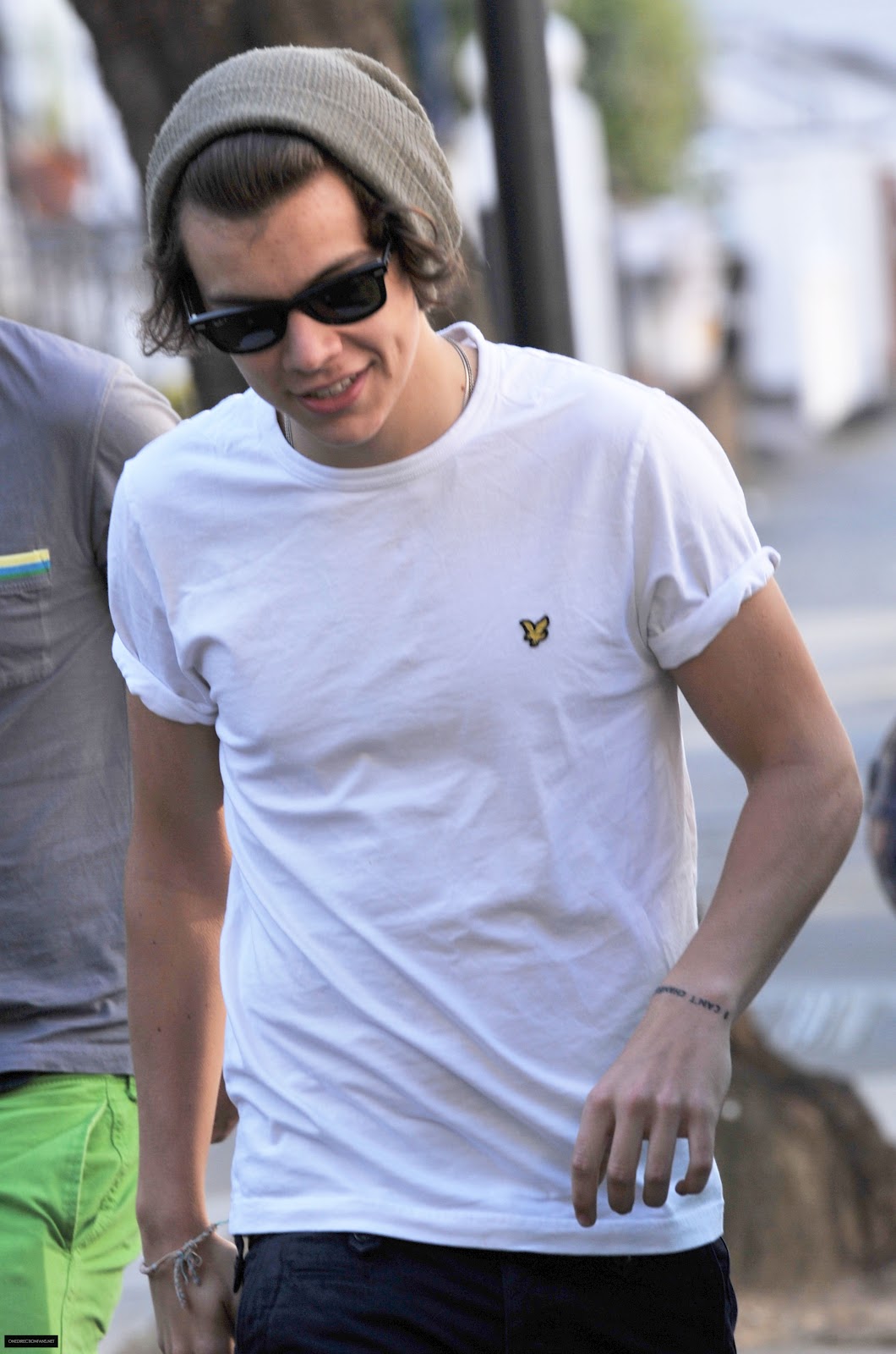 Harry Styles arrive à un studio d’enregistrement, chino bleu marine, t-shirt blanc Lyle & Scott.