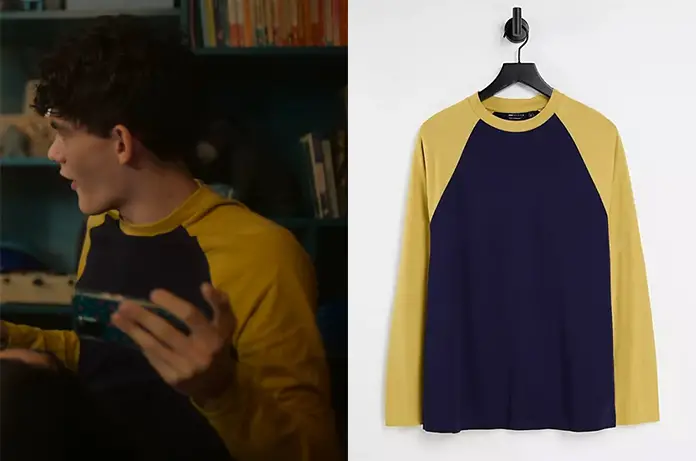 D’abord ce t-shirt à manches longues, jaune et bleu marine. On le trouve ici