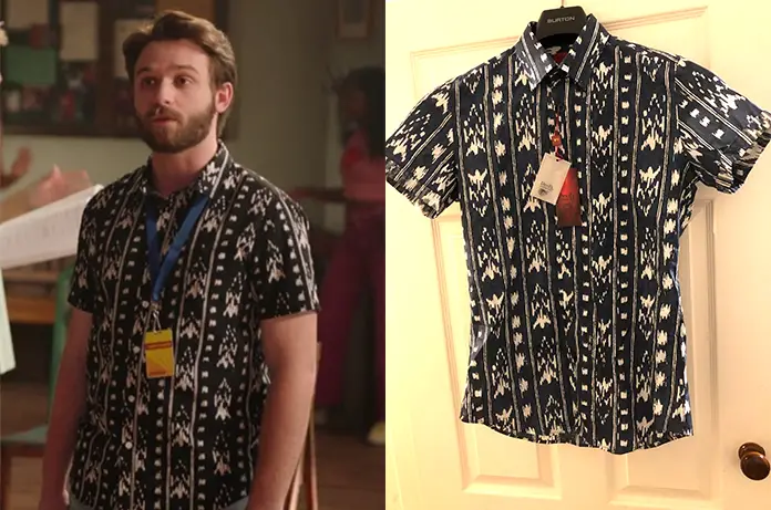 Channing (Ben Stillwell) revient filmer au camp dans HIGH SCHOOL MUSICAL : THE MUSICAL : THE SERIES 3×05. Il porte une chemise avec des motifs imprimés.