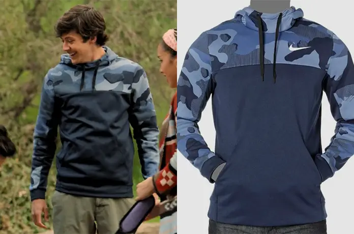 E.J. Caswell (Matt Cornett) porte ce sweat à capuche dont le haut est en imprimé camouflage bleu, dans High School musical :the musical : the series 3×03. Il est en rupture de stock, mais on le trouve encore sur eBay ici