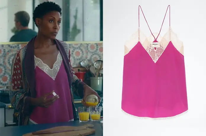 Marsha (Christine Adams) prend son petit déj dans Hijack 1×01 dans ce top rose, bordé de dentelles blanches.