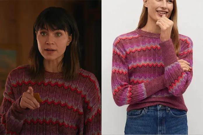 Plus tard, elle porte est un modèle à motif zigzag multicolore, dans des teintes plus chaudes. Un article Mango, que l’on trouve encore en seconde main.