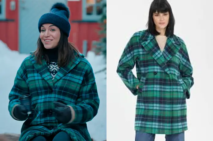 Le premier épisode montre Johanne dans un manteau à carreaux bleus et verts. Il s’agit d’un modèle d’une ancienne collection Emme Marella