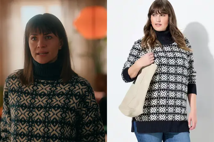 Sous ce manteau, elle avait enfilé un pull de saison, avec un motif flocons de neige. Il est dispo ici