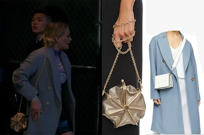 Pour aller au Fomo, dans How I met your father 1×02, Sophie (Hilary Duff) porte un manteau bleu et un petit sac doré en bandoulière.