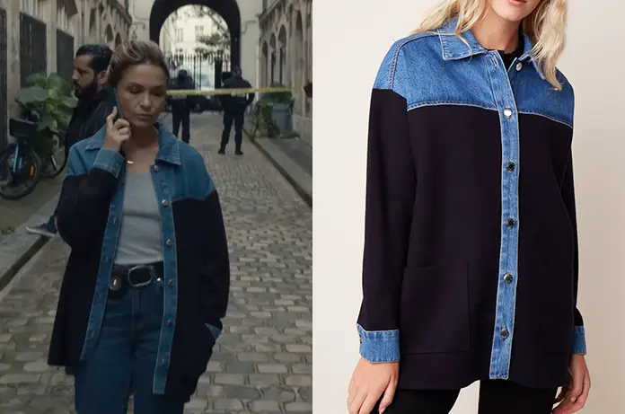Nathalie Fontaine (Barbara Schulz) téléphone à Mathias dans le premier épisode de I3P. Elle porte une veste en denim à deux tons de bleu.
