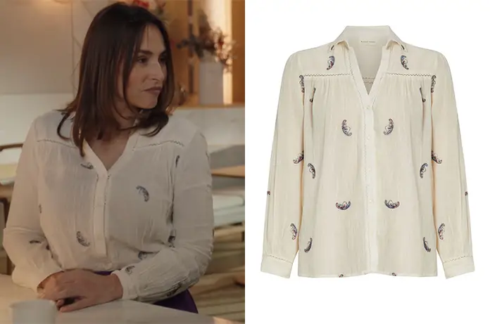 Rose (Vanessa Demouy) porte cette magnifique blouse Le chemisier est orné de motifs cachemire brodés à un seul fil, dans Demain nous appartient 661.