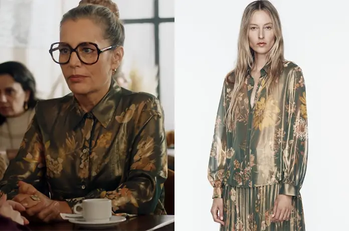 Elle porte une chemise avec un imprimé métallisé que l’on trouve ici.