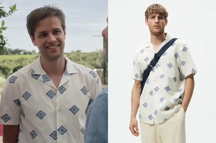 Swan (Cyril Durel) est un nouveau venu dans Ici tout commence 444. Il porte une chemise blanc cassé avec des petits motifs géométriques. Elle est en rupture de stock sur le site de Zara.